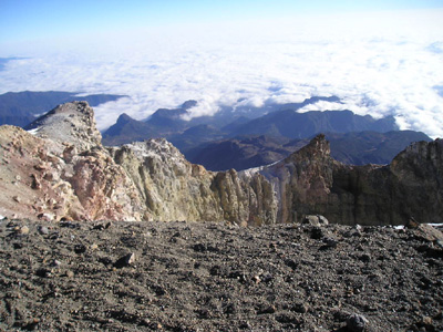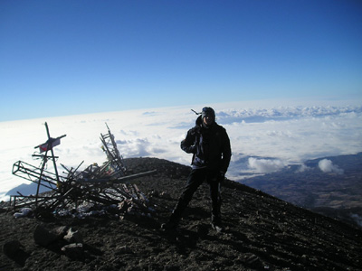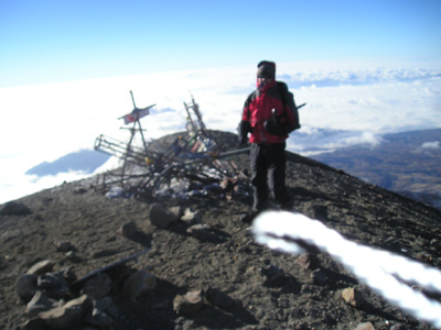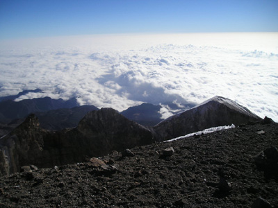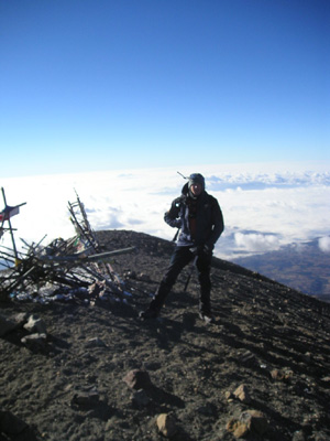 We set off at 12.30am as the night before the wind and cloud was so bad that nobody seemed to have summited, and we had noticed that at 7am the summit seemed clearer! So we planned on summiting as early as possible – we eventually arrived at the glacier where 2 of us continued to climb (the other 2 in our party decided to return as one of them was not too well equipped and the other had summited previously!). The wind was howling across the glacier and some of the gusts nearly blew you off your feet – not ideal weather to be walking to the crater and on up to the summit. We continued anyway hoping that it may calm down, although it wasn’t to be and when we arrived at the crater rim we could hardly even hear each other speak – the summit was anther 15 minutes or so where we took a couple of pictures and got off as quickly as possible.