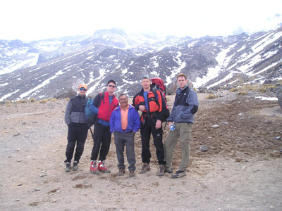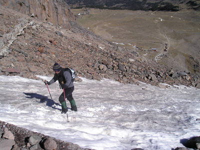 We underestimated the temperature on summit day and I wore only Windstopper gloves giving me cold hands most of the way up – one of our party wore leather boots which was his downfall – ideally plastics were the way to go and my Scarpa Alphas were adequate.